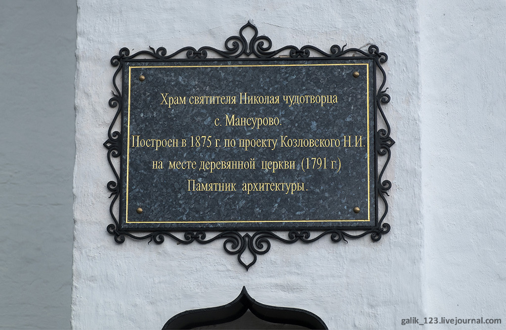 9. Никольскую церковь в селе Мансурове можно считать одним из лучших творений Н.И Козловского. Козловский работал архитектором при московских императорских театрах. В Москве строил церкви, колокольни, жилые дома.