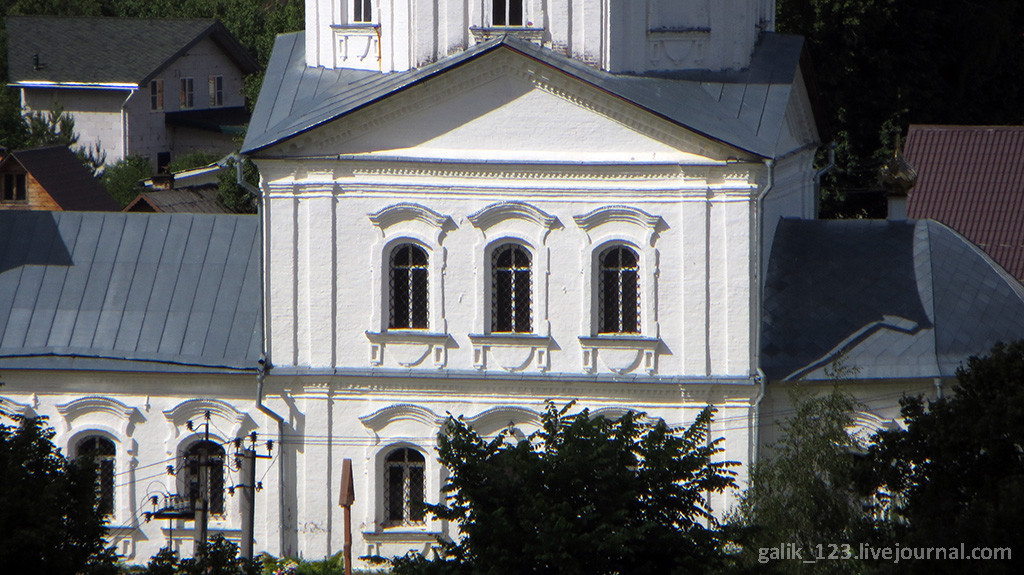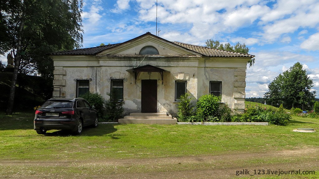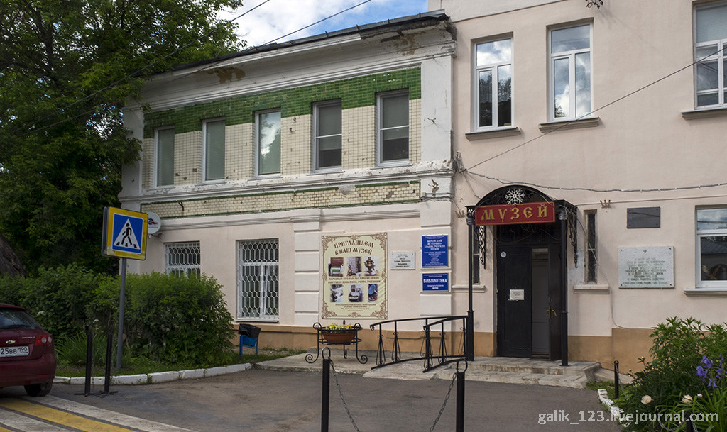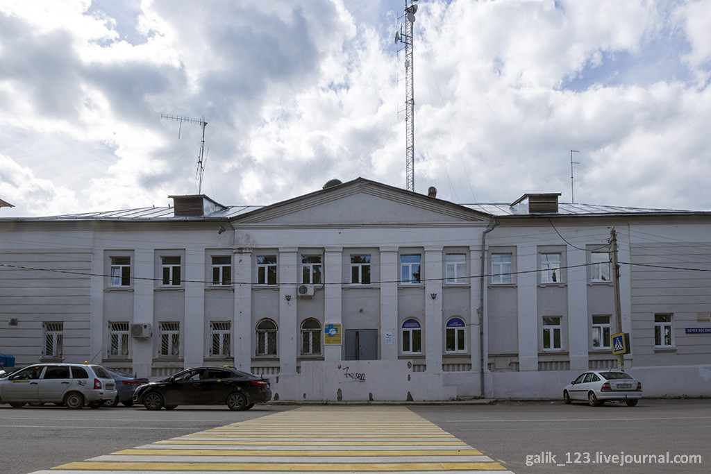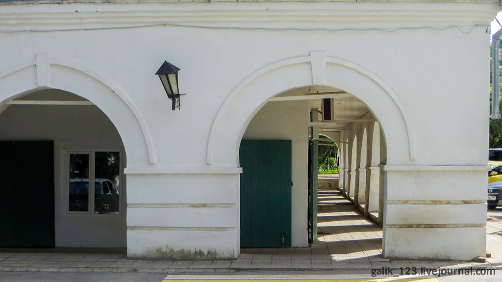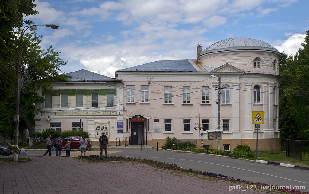 26. В период бурного развития железных дорог Верея осталась в стороне от них, что превратило её в тихую провинцию. Гражданская застройка в Верее оказалась весьма проста и небогата. Видимо, во времена купеческого расцвета в XVIII веке строили больше из дерева, а французы в 1812 году город сожгли. Здание с ротондой — бывшее уездное училище 1788 года. Сейчас в нём располагается краеведческий музей.