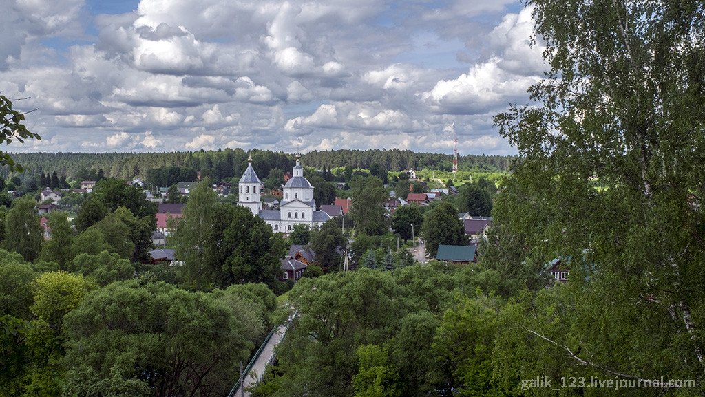 23. С валов открывается живописный вид на Заречье и леса, окружающие город. Видна церковь Богоявления Господня. К ней можно подойти по мостику через Протву. Церковь построена в 1777 году за счет средств купца М.Е. Седельникова на месте разобранной деревянной церкви святых Косьмы и Дамиана. Колокольню пристроили к церкви в 1782 году
