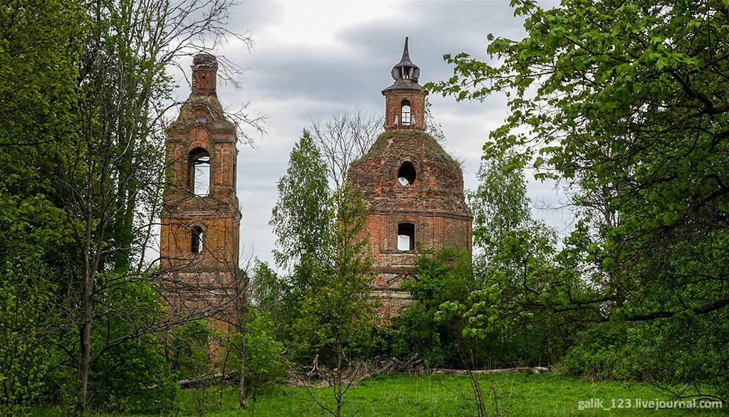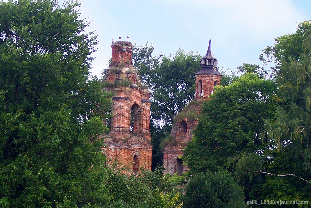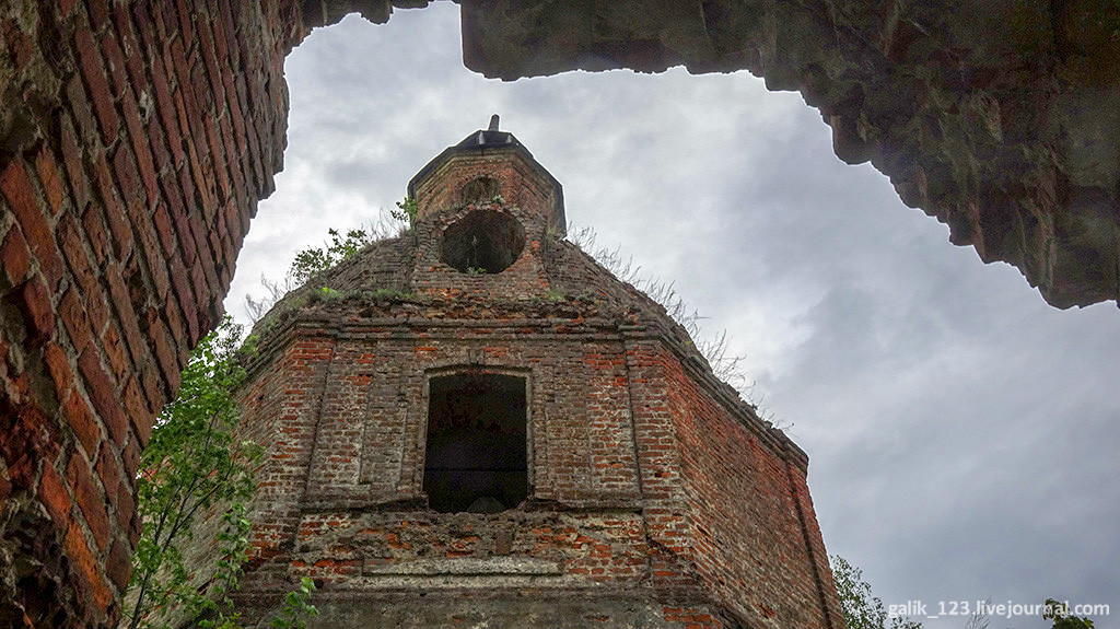 12. Кирпичный храм типа восьмерик на четверике с небольшой трапезной и колокольней — хороший образец барокко. Имел храм один купол главу, еще одна венчала каменную колокольню.