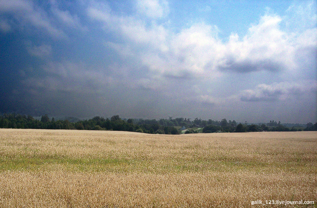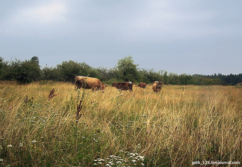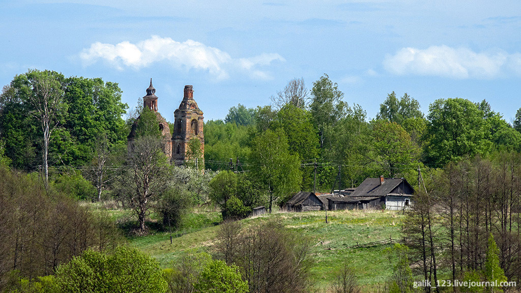 4. Места эти очень живописные, церковь видна по дороге слева. В советские времена в Максимкове был богатый совхоз, стада коров паслись на этих полях, а сейчас только пустые полуразрушенные коровники попадаются по пути.