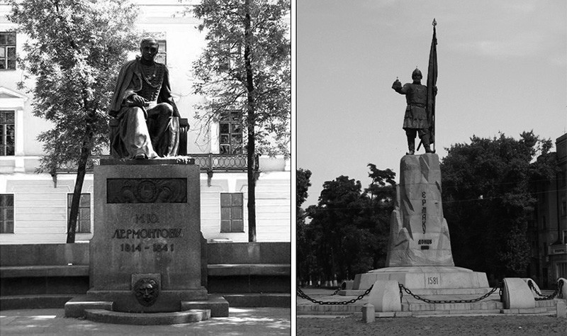 Слева — Санкт-Петербург, памятник М.Ю. Лермонтову. Справа — Новочеркасск, памятник Ермаку