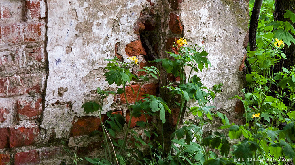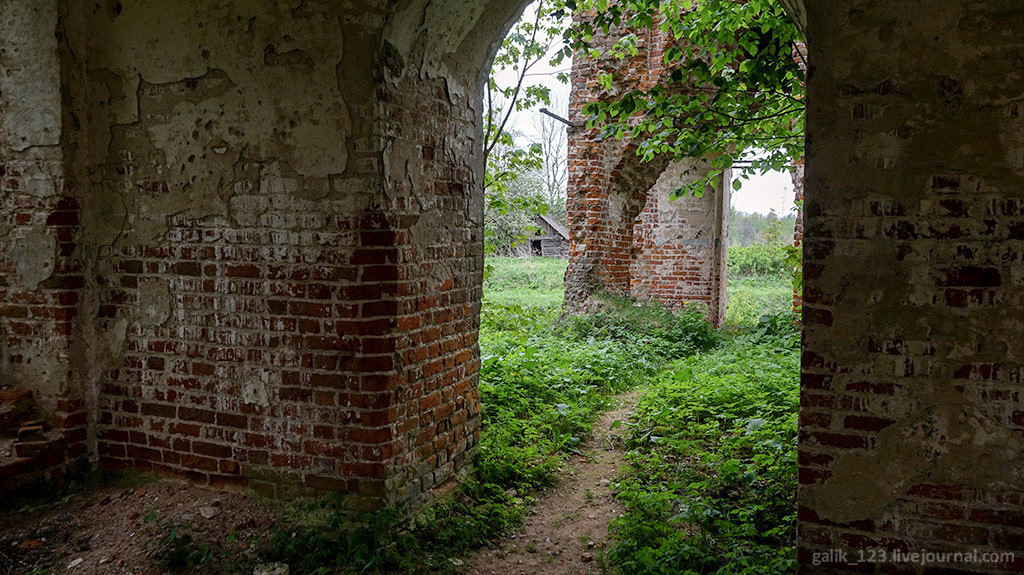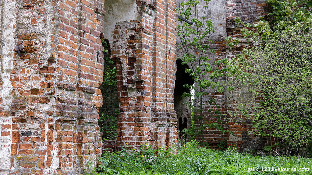 11. Сохранились руины Казанской церкви, заросшие кустарником.