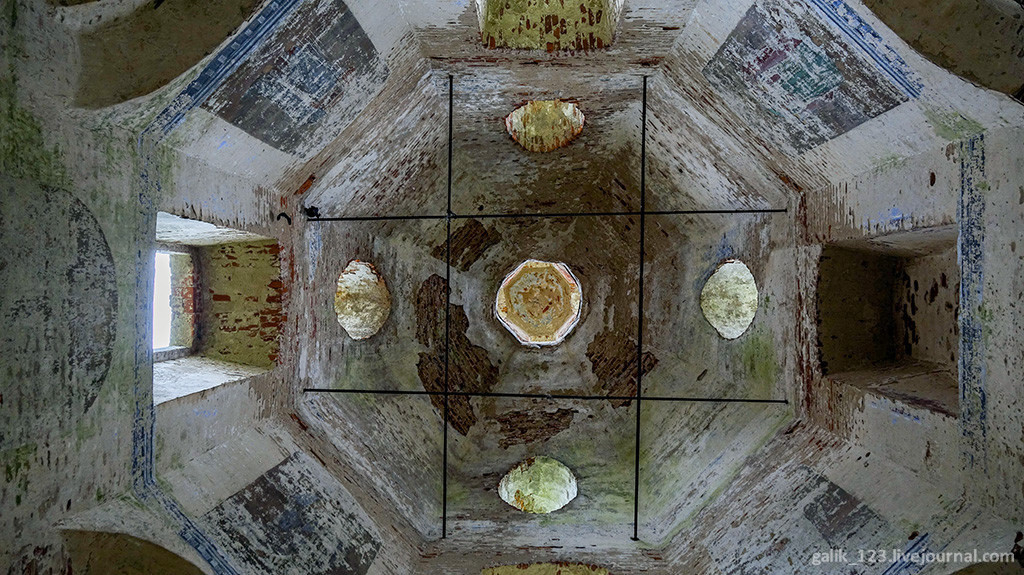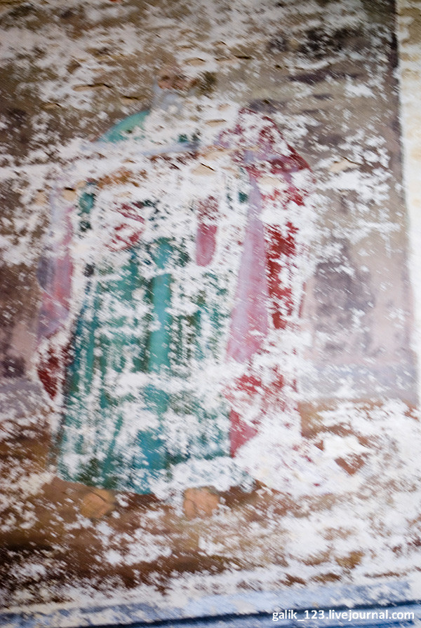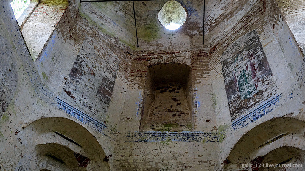 22. Если войти под эти своды, заброшенный храм поражает своим величием. На стенах сохранились фрагменты живописи предположительно второй половины XIX века. На парусах ещё несколько лет назад можно было различить фигуры Евангелистов, на южной стене четверика — Преображение Господне.
