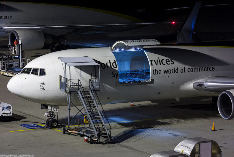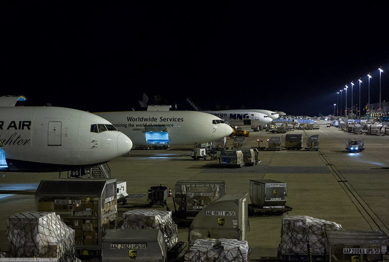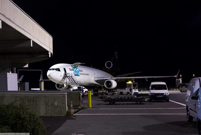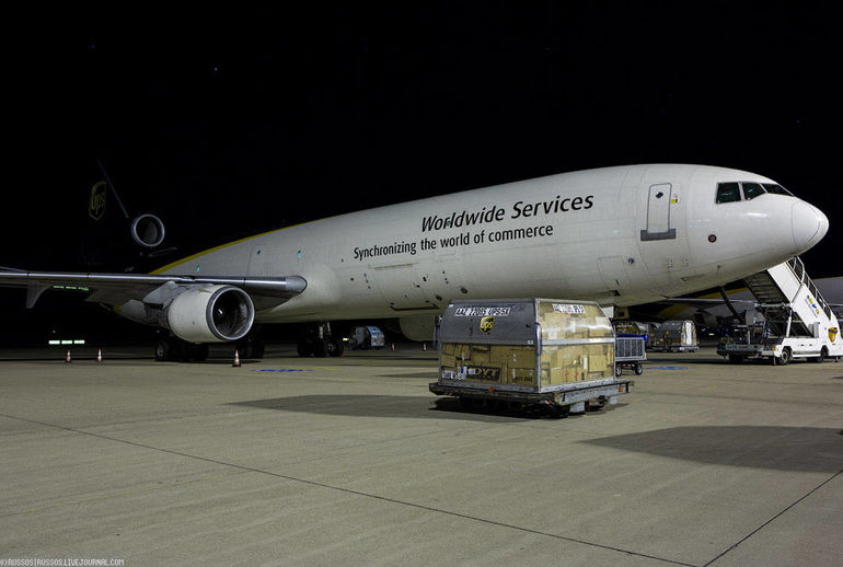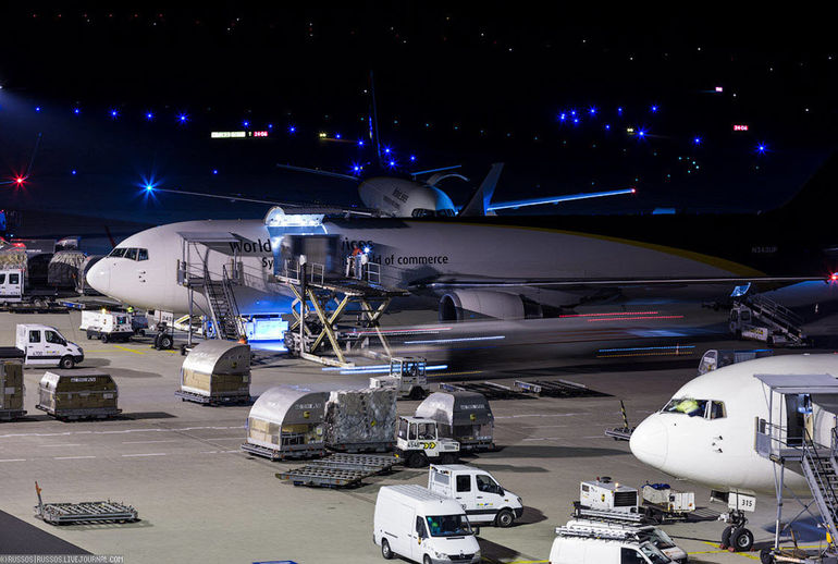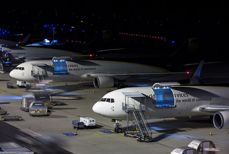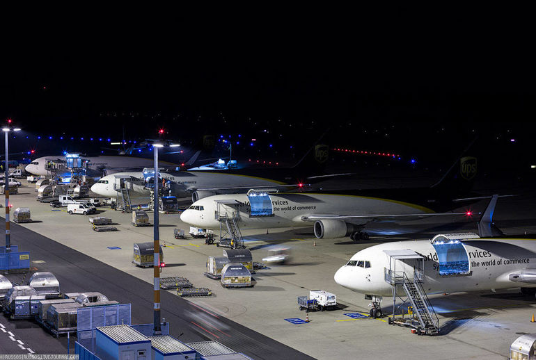 6. Но самое интересное, конечно, происходит на летном поле аэропорта. Ночью тут кипит работа — несколько десятков самолетов (у UPS 64 стояночных места) находятся под разгрузкой и погрузкой. За сутки выполняется 72 рейса по всей Европе. А через Кельн — 37.