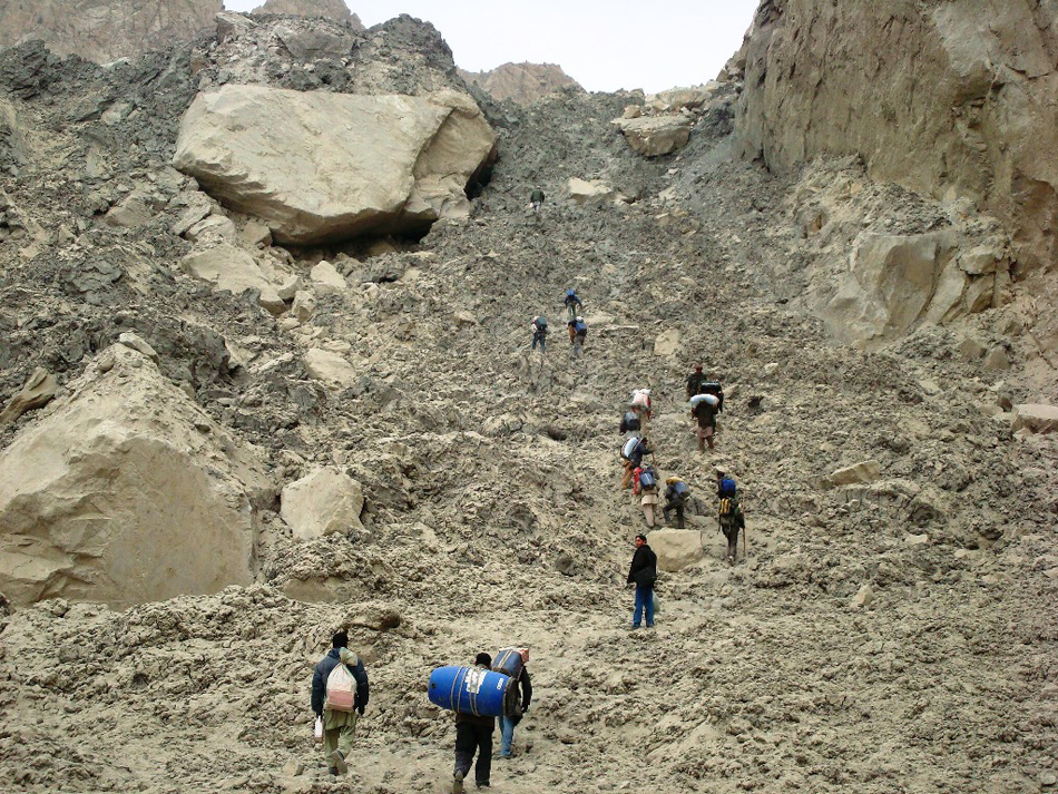 16. Исход. Люди выбираются в большой мир через осыпь. Фото Zulfiqar Ali Khan.