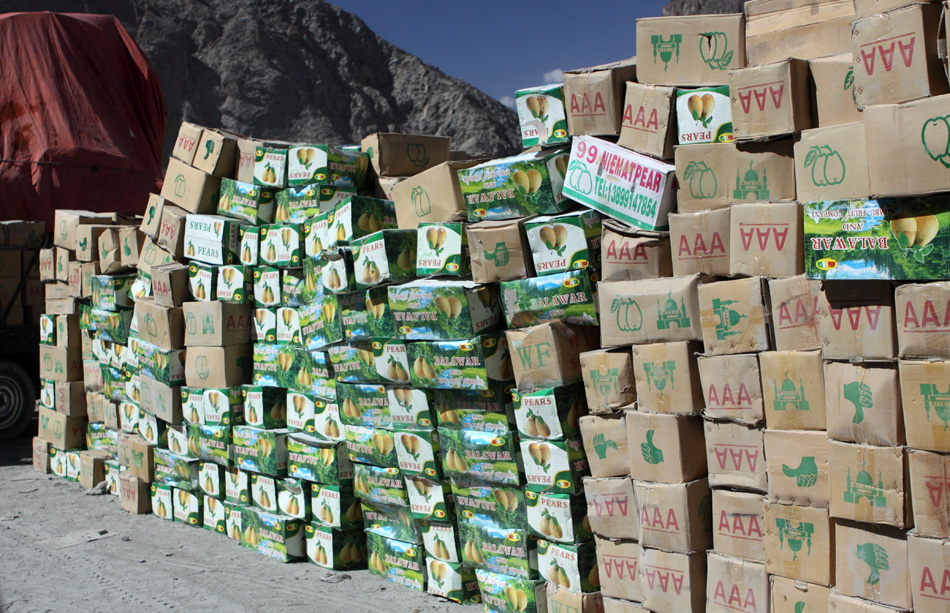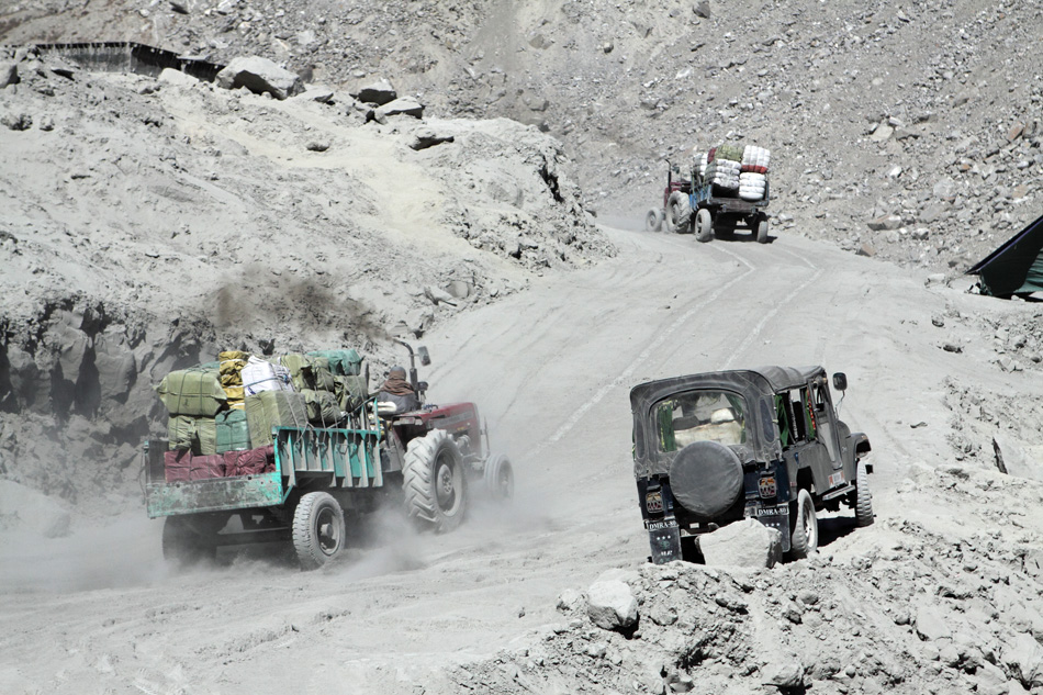Миновав осыпь, трактора с прицепами выезжают на Каракорумское шоссе, груз вываливается на обочины. Далее его перегружают на поджидающие здесь грузовики. При перевозке грузов в Китай все манипуляции проделываются в обратном направлении.