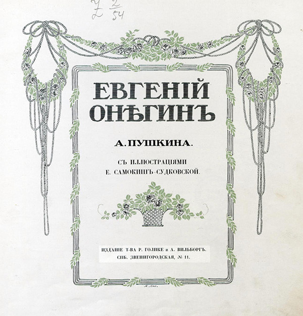 Пушкин А. Евгений Онегин. С иллюстрациями Е.Самокиш-Судковской. Издание первое. Пг., издание т-ва Р.Голике и А.Вильборг, 1908, 120 с., с илл. 26,2 x 23,2 см. Титульный лист работы А.Лео.